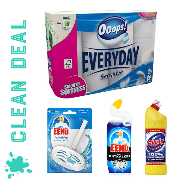 Glorix Toiletreiniger Original (750ml) – Verwijdert bacteriën en houdt je toilet langdurig schoon. WC Eend Toiletblok Ocean Fresh (40gr) – Zorgt bij elke spoelbeurt voor een frisse geur en bescherming tegen kalkaanslag. WC Eend WC Reiniger Ontkalker (750ml) – Effectieve formule die hardnekkige kalk en vuil moeiteloos verwijdert. Ooops! Everyday Toiletpapier 3-laags (24 rollen) – Zacht, sterk en extra comfortabel voor dagelijks gebruik.